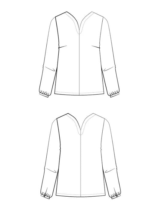 Niveau de couture : intermédiaire. Les points techniques du patron sont : coudre des pinces poitrines, coudre des encolures en arrondi avec une propreté, le montage de la manche et du poignet avec la fente indéchirable en bas de la manche.