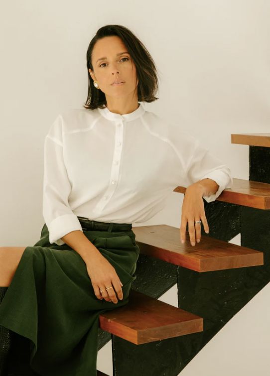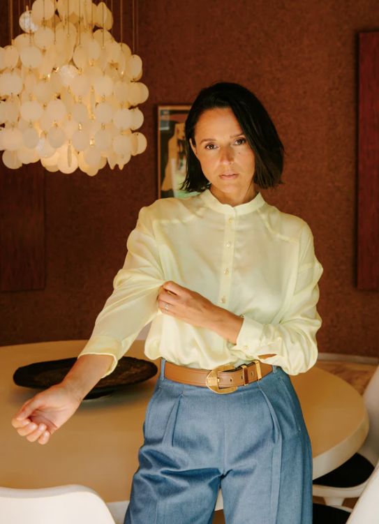L’emmanchure est basse, la coupe est droite et un peu ample, et sa longueur est pensée pour être glissée nonchalamment dans une jupe ou un pantalon.