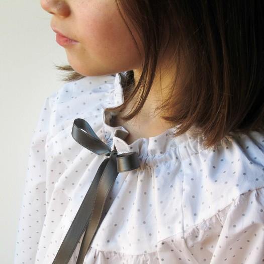 Raglan sleeve blouse, available in long sleeve and short sleeve versions. The gathered neckline, open at the front, is held in place by a tie. An elastic tightens the bottom of the sleeves and adds a little extra feminine touch.