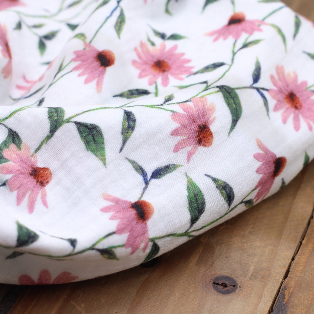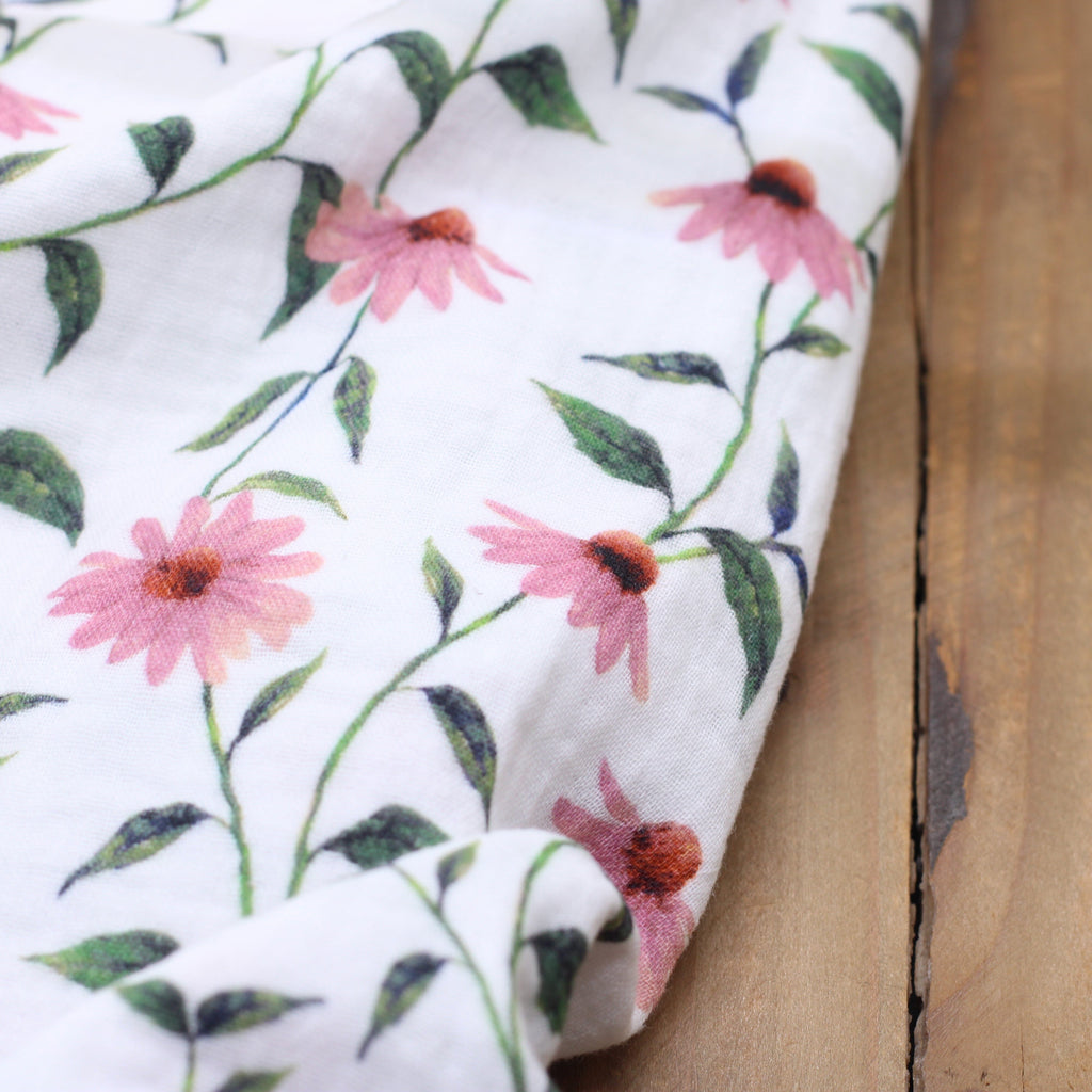 Double gaze de coton - PINK FLOWERS- Blanc
