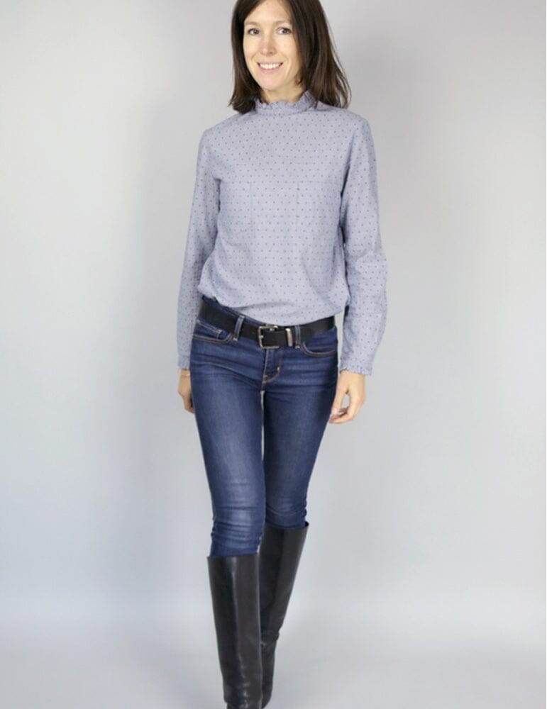 Blouse au col montant style victorien avec deux finitions possibles : soit smockée, soit pied de col avec froufrou. Manches courtes ou longues avec des finitions identiques au col. Blouse légèrement cintrée et absence de pince poitrine pour un style résolument actuel. Les poches plaquées sur la poitrine confèrent un joli contraste à cette blouse plutôt classique.