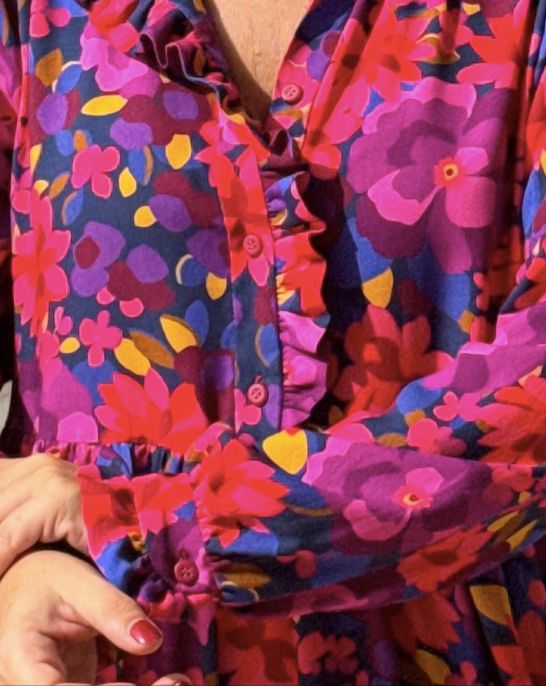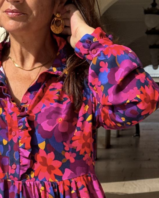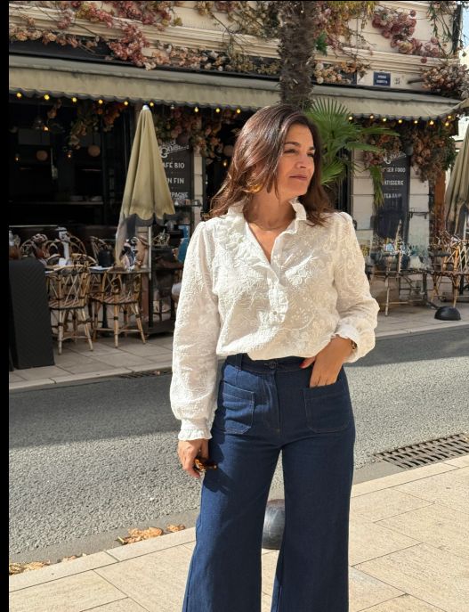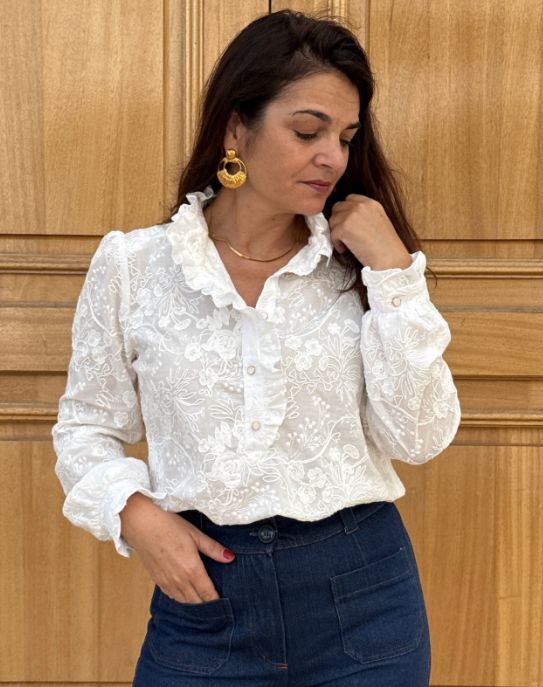 Le patron Albane se distingue par son col volanté qui court le long de la patte de boutonnage, soulignant avec délicatesse son esprit bohème.