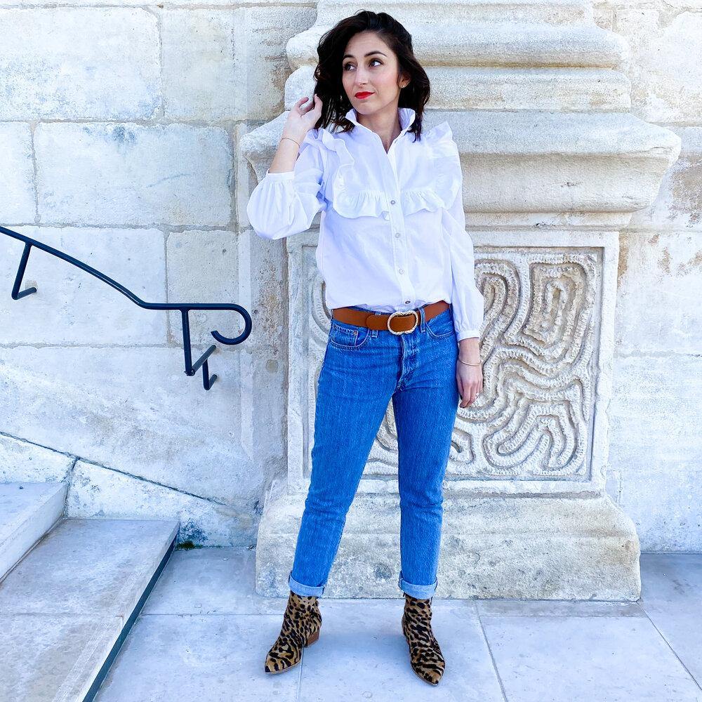 Margerie est une chemise ou robe chemise structurée par ces volants tout le long d’une encolure carrée donnant du caractère au modèle.