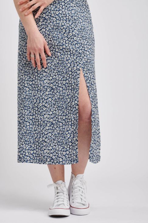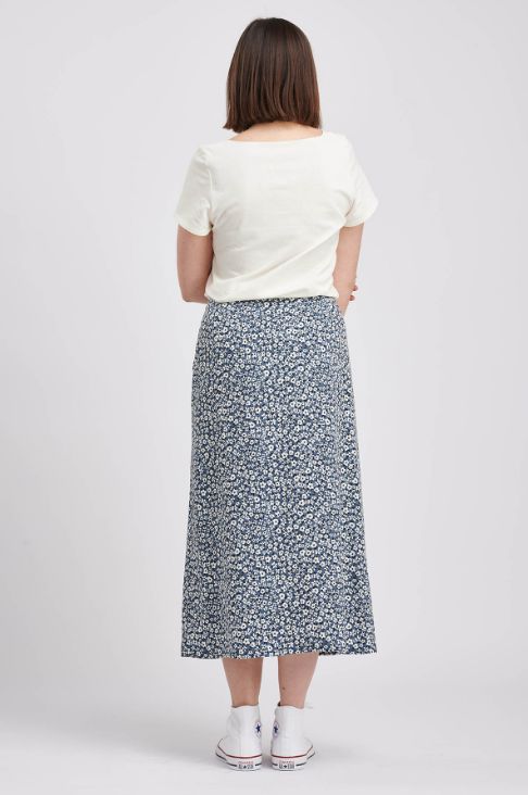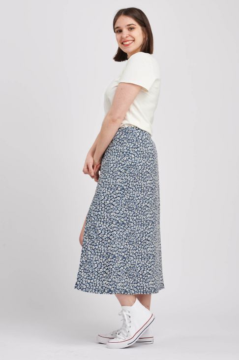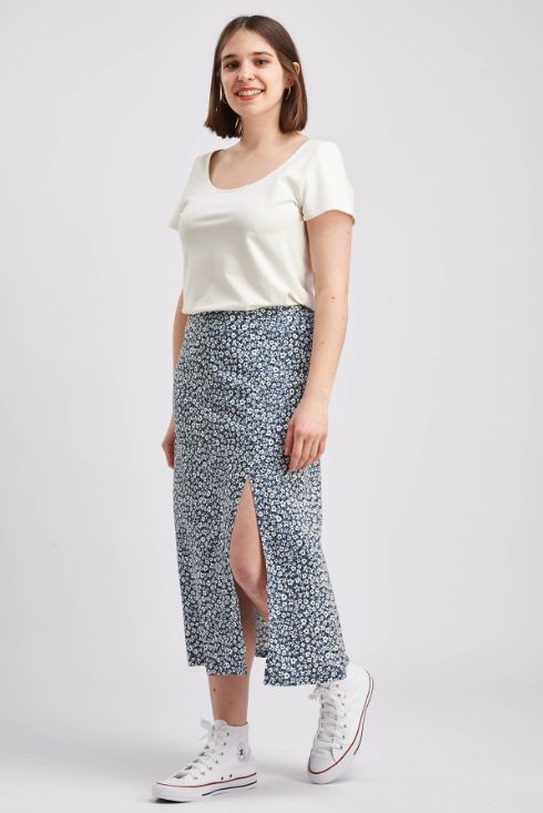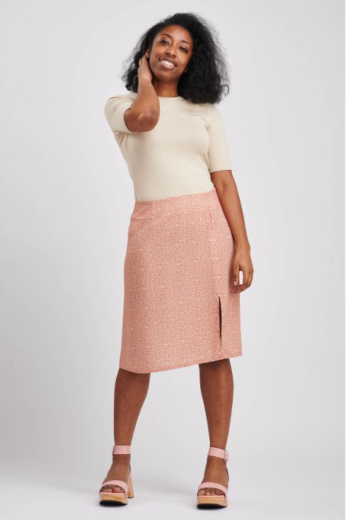 Je suis Rachel, une jupe fendue inspirée des années 90. Ma taille se pose au-dessous de la taille naturelle, je suis légèrement évasée et j’ai une fente qui commence mi-cuisse. On peut me décliner en 3 longueurs : midi, sous-genou et mi-cuisse. Je suis ajustée de la taille au bassin grâce à des pinces. Je m’ouvre grâce à une fermeture invisible au côté, et je suis finie à la taille par un enforme. Ma version mi-cuisse peut inclure la fente ou pas.