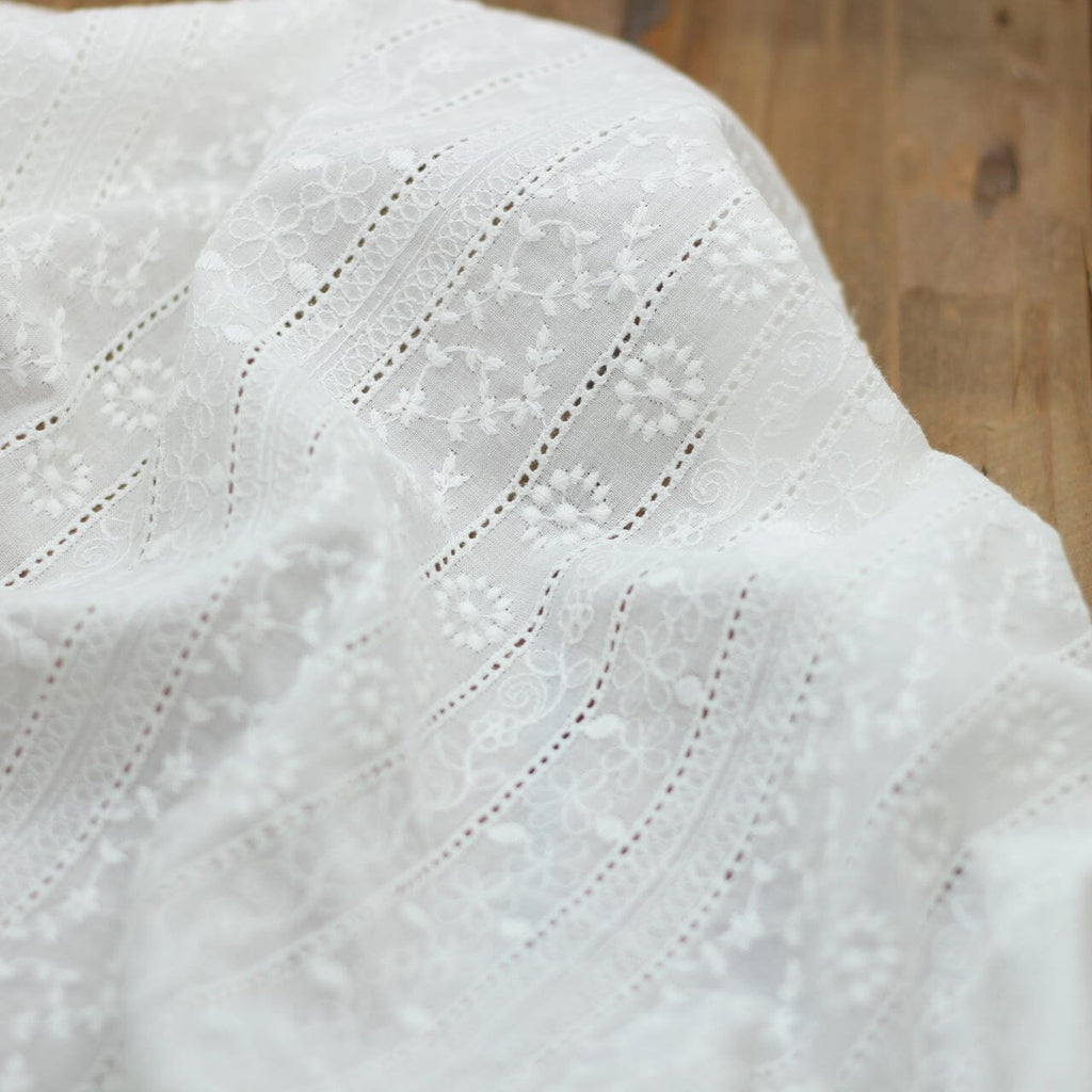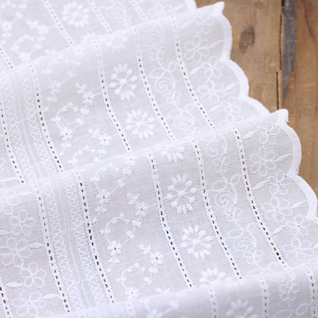 Description : Tissu coton brodé festonné des 2 cotés de la lisière.