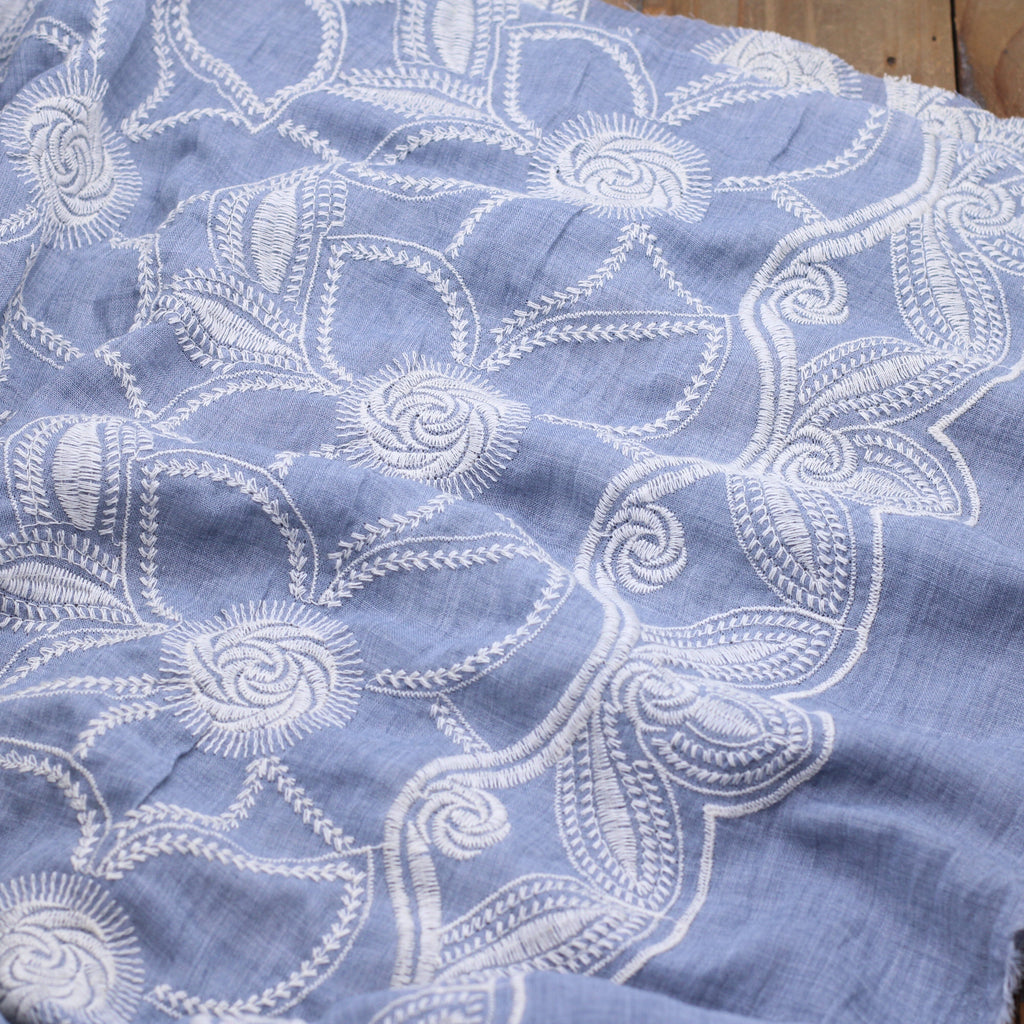 Tissu coton brodé fleuri DUSTY -Bleu glacier