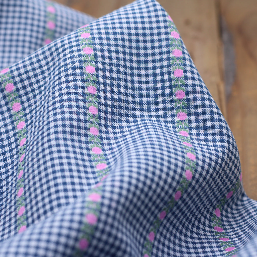 Tissu coton jacquard brodé vichy fleurs - Bleu pétrole/Rose