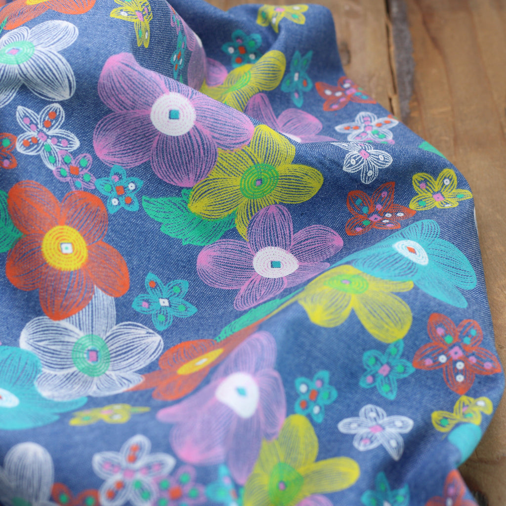 Tissu Coton Denim imprimé FLOWERS - Bleu