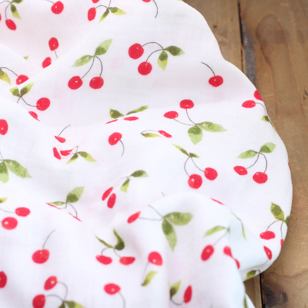 Double gaze de coton - CHERRIES CERISES- Blanc