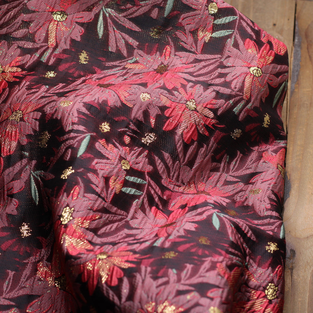 Description : Jacquard Lurex, motif fleuri corail, bordeaux et métalisé or .Très beau rendu pour vos tailleurs, vestes, jupes, shorts, bombers...