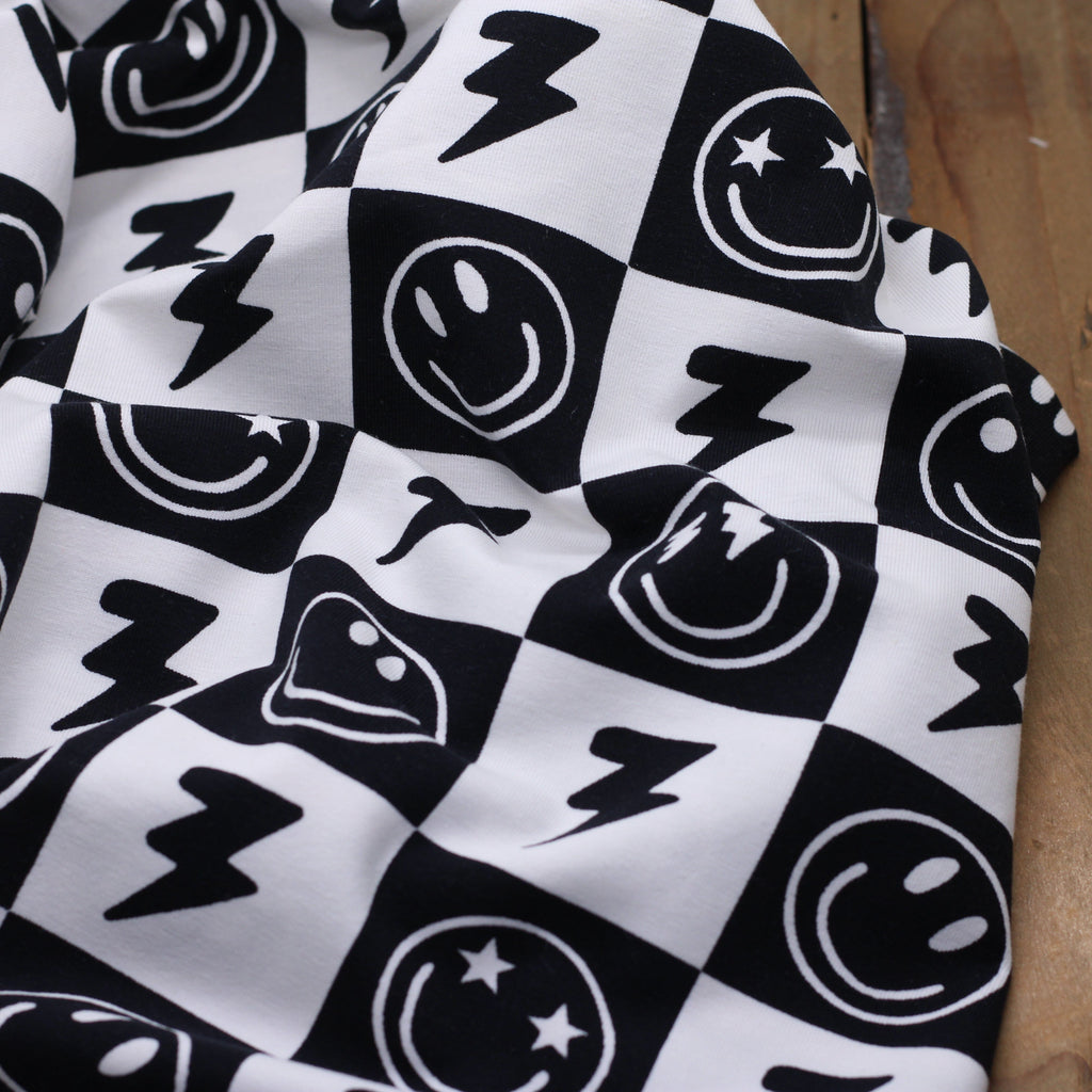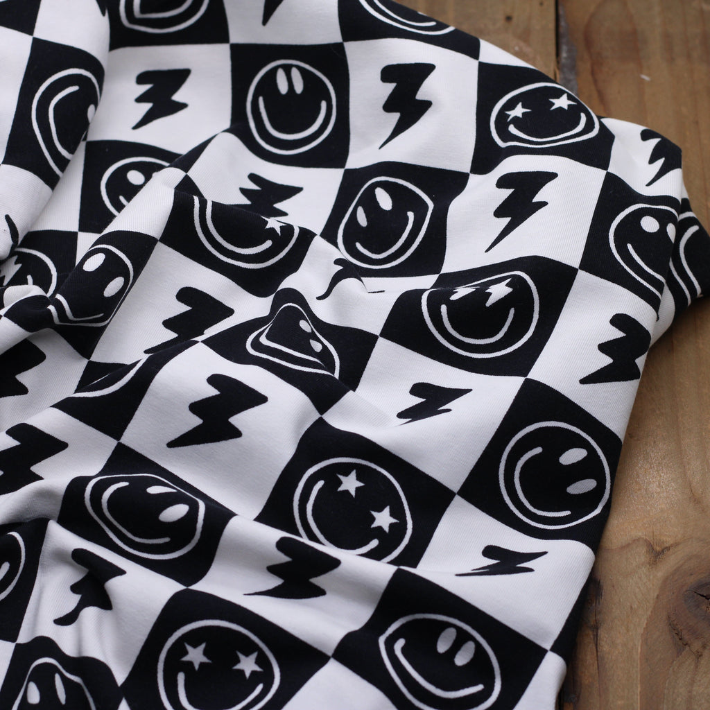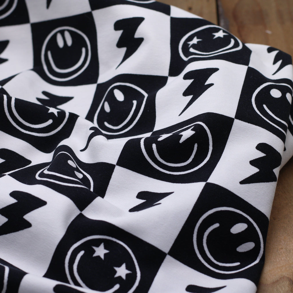 Description : Tissu Jersey de coton imprimé de smiley sur fond damier noir/blanc