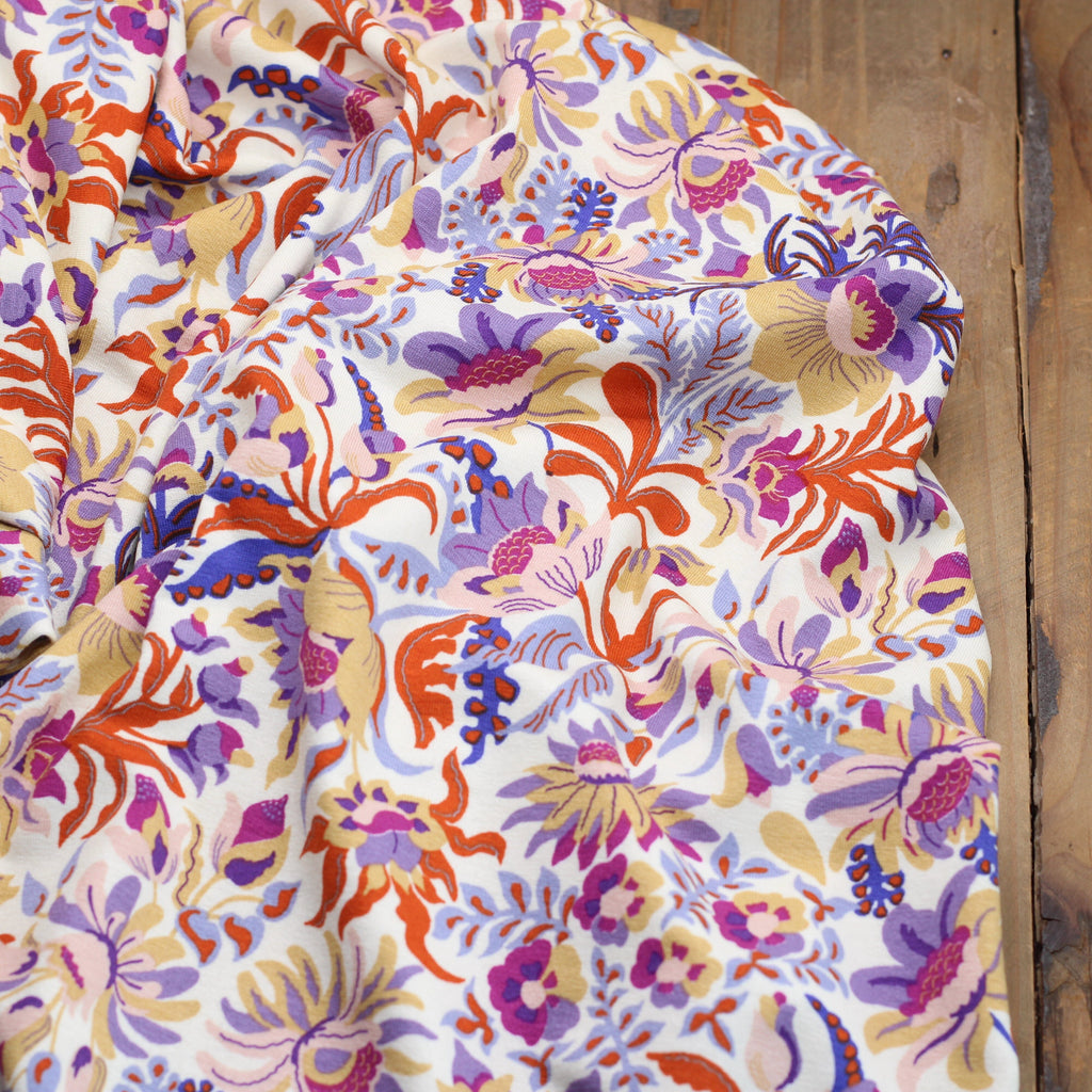 Description :Tissu Jersey de viscose imprimé.Inspiré par la tendance Purple Rights, ce tissu maille viscose allie fluidité et douceur à un motif vibrant qui célèbre la créativité et la liberté. Sa composition extensible, 95 % viscose et 5 % élasthanne, en fait le tissu parfait pour la confection de robes, de t-shirts et de chemisiers fluides et légers. Son motif illustre la connexion entre la mode et la revendication des espaces créatifs, où la couture devient un symbole d'expression personnelle.