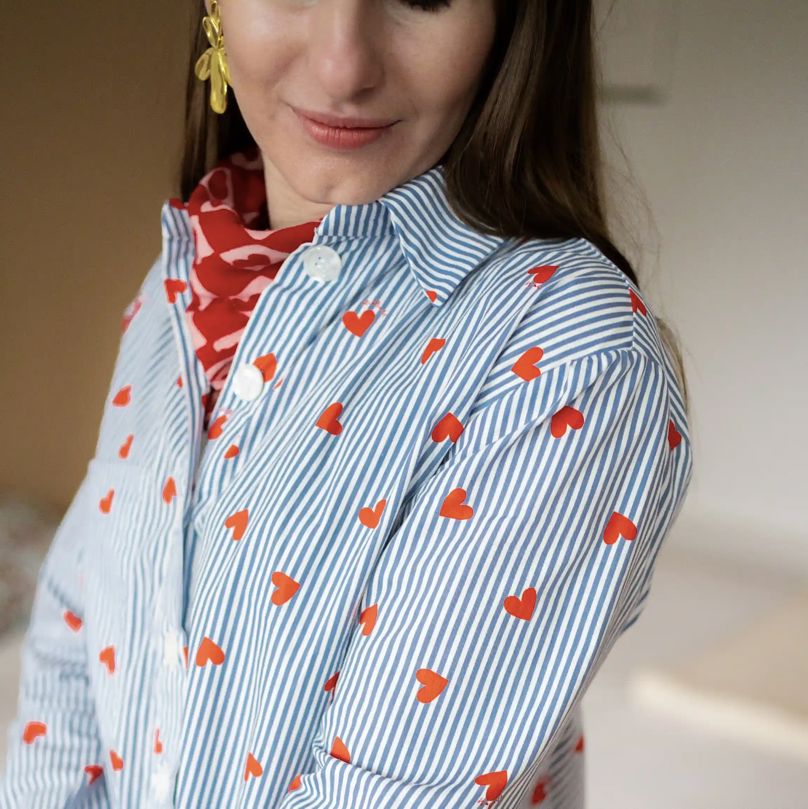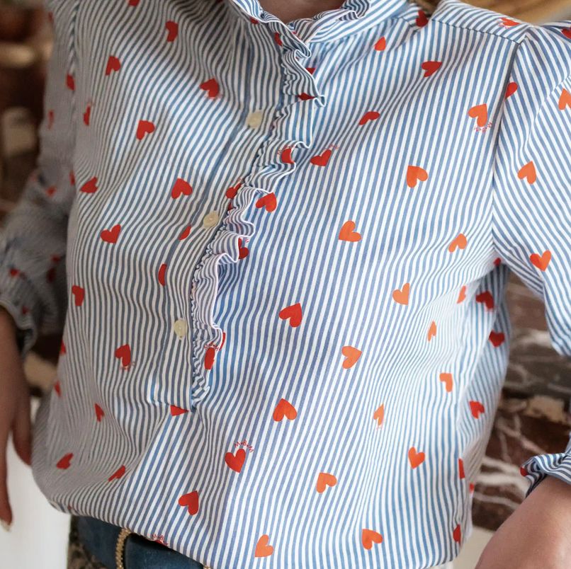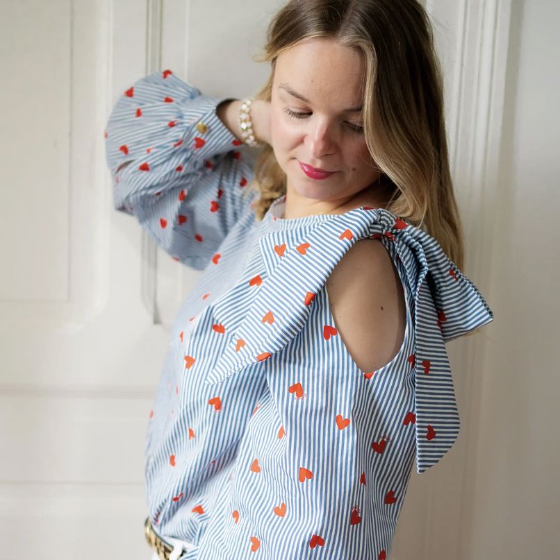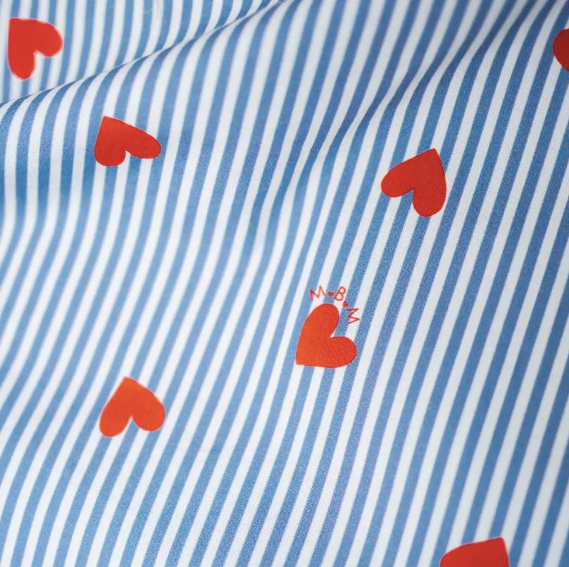 Description : De jolis petits coeurs rouges imprimés sur rayures blanches et bleues