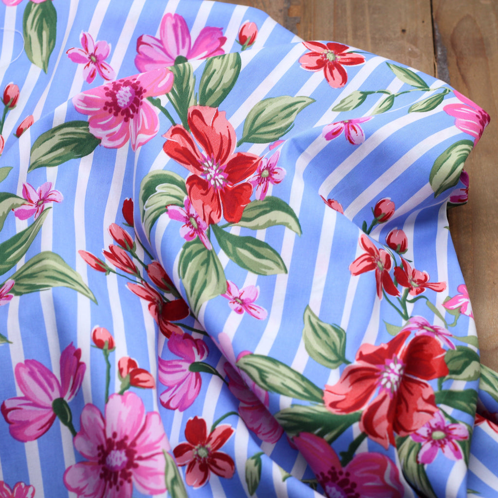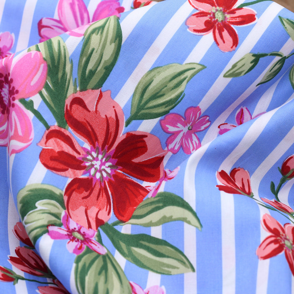 Description : Tissu popeline de coton - rayé fleuri- Blanc/Bleu