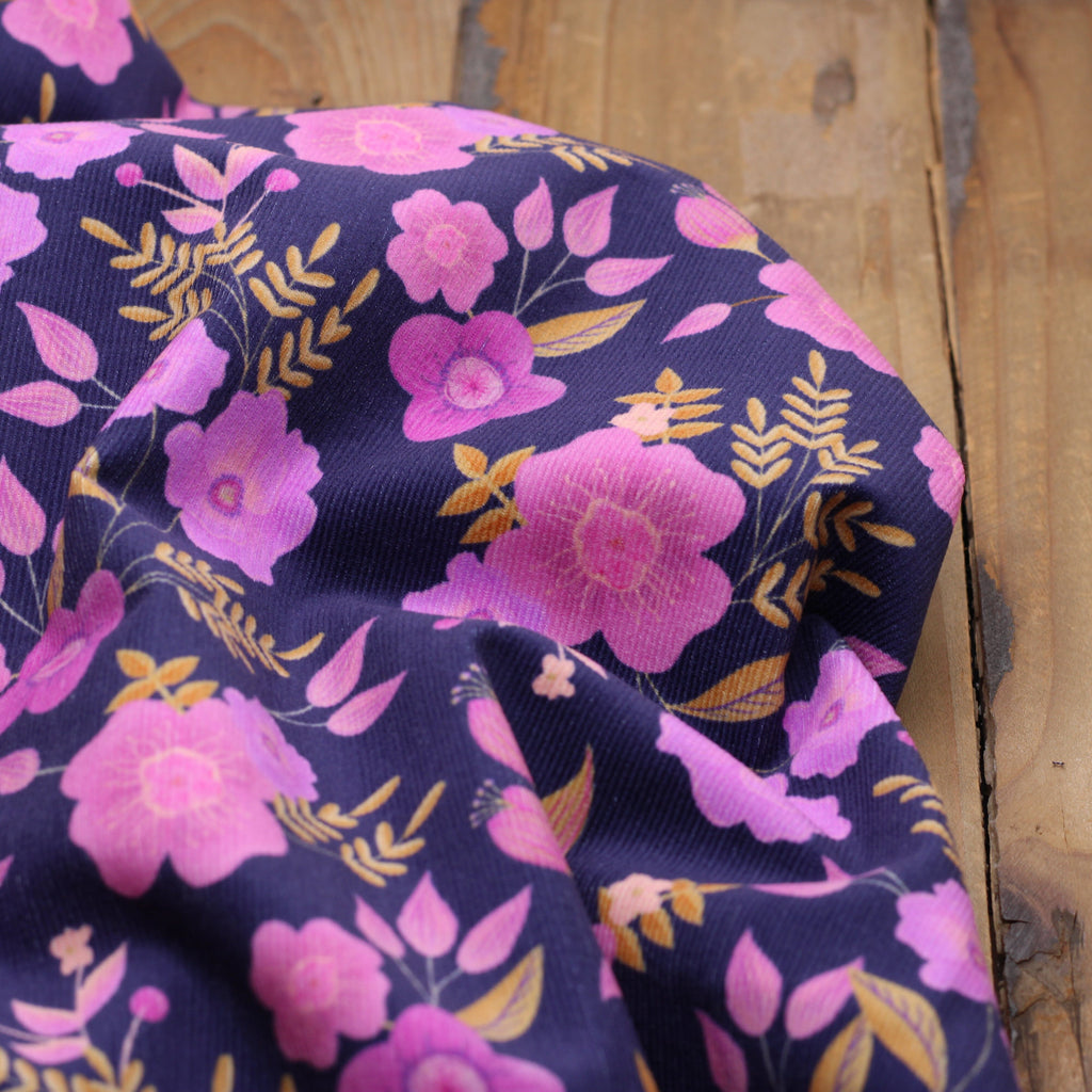 Description : Velours milleraies imprimé fleuri sur fond bleu marine