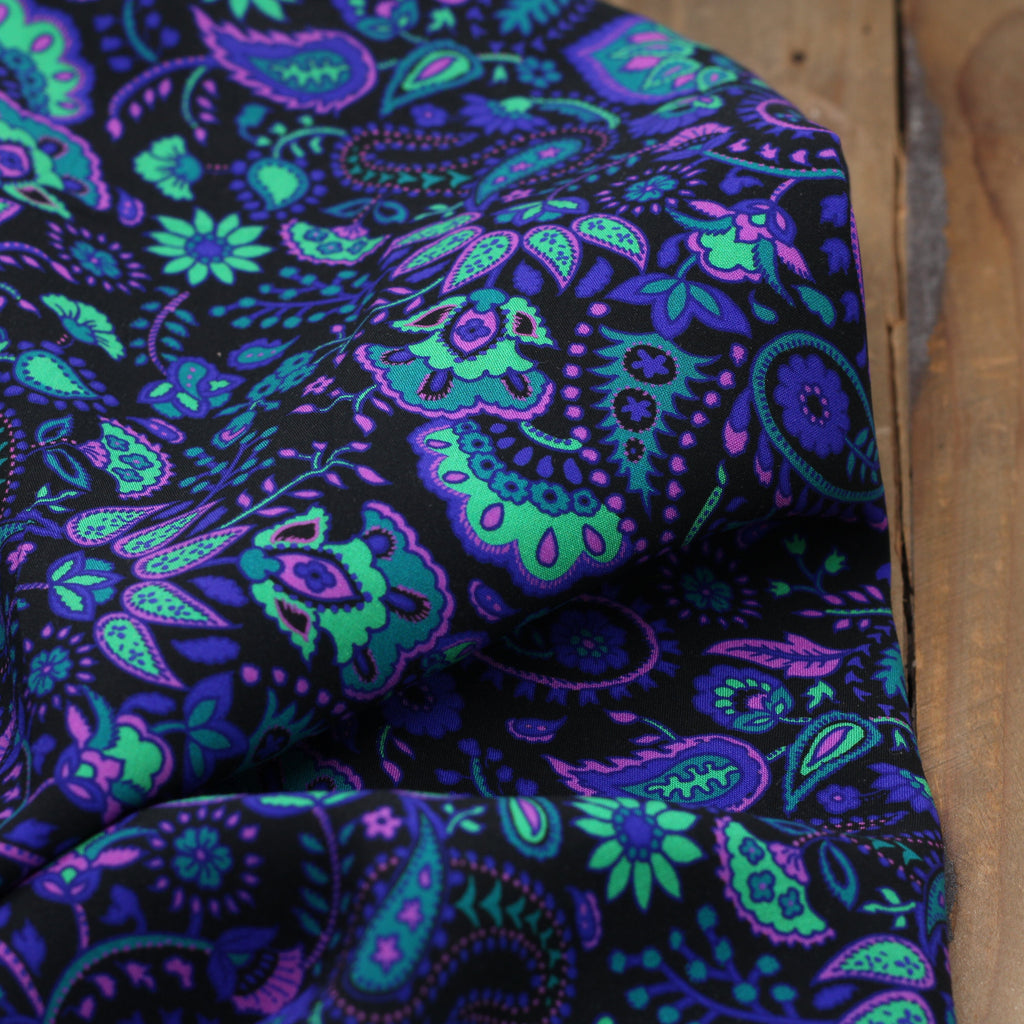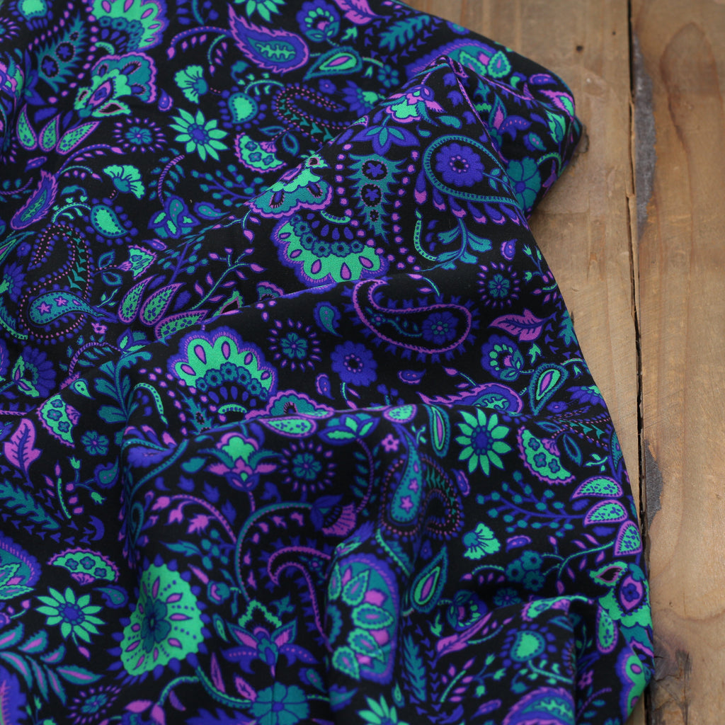 Fond : Motif fleuri cachemire violet, vert acidulé, bleu, rose fuchsia... sur fond noir