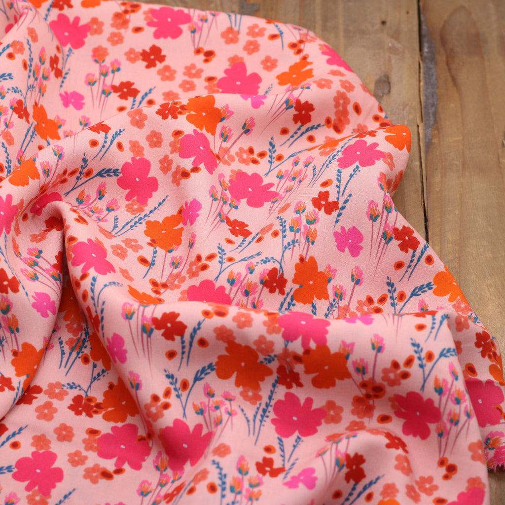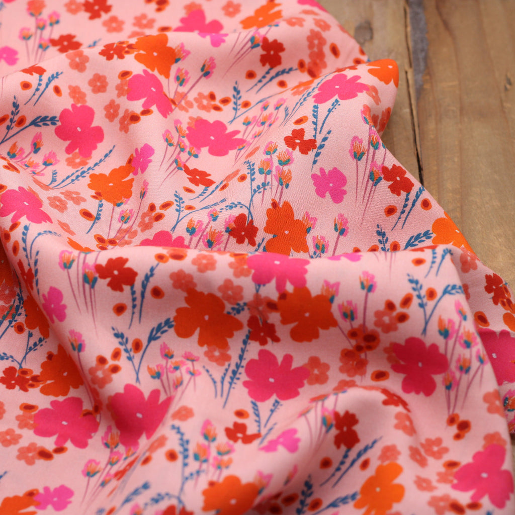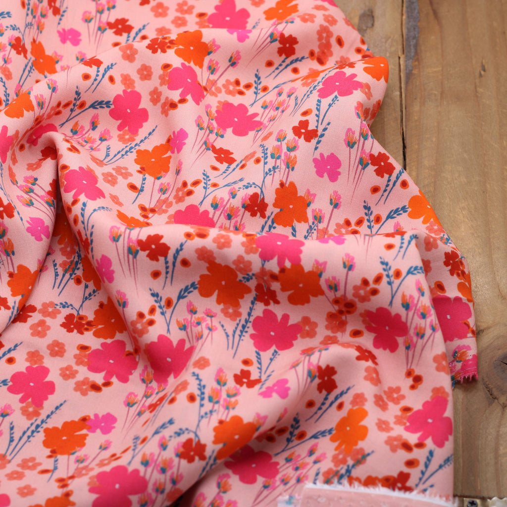 Fond : Motif fleuri orange, terracotta, rose fuchsia... sur fond rosé