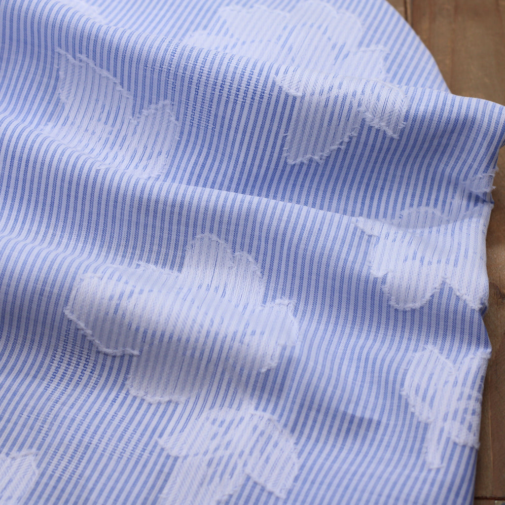 Tissu voile de coton brodé RAYE/FLEURI blanc bleu